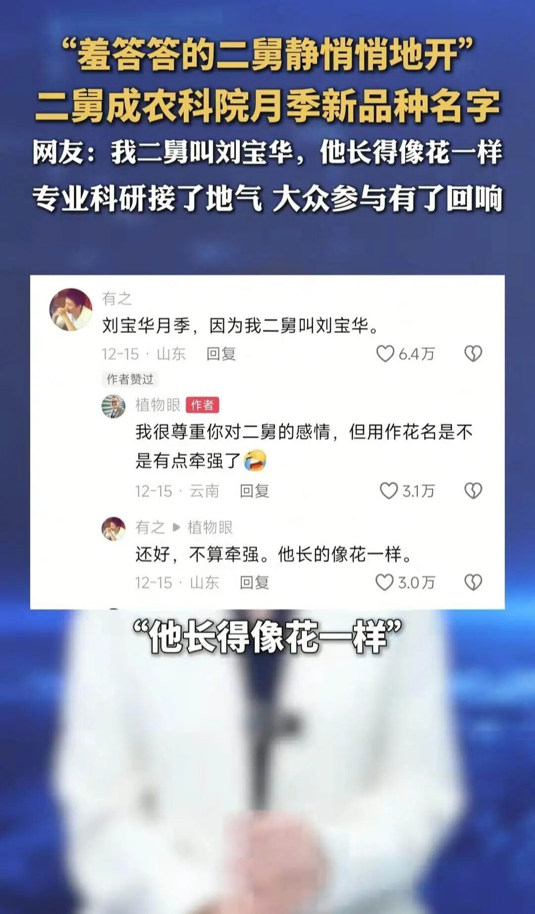 “原本只是想玩梗,加之和二舅关系亲近便随口一提,没想到这条留言能火出圈。”康先生事后回忆道。这条带着生活暖意的调侃留言,很快引爆评论区,截至12月25日,点赞量高达11.9万次,远超其他所有命名提议。以一人一票把二舅“送出道”的网友们,创作激情一经点燃便刹不住车,不仅延伸出“羞答答的二舅,静悄悄的开”等一众热梗,甚至连英文名都贴心想好,直呼其为angel;更有网友调侃,宝华月季的“弱点”是正月里不能修剪,各类玩梗互动趣味十足。